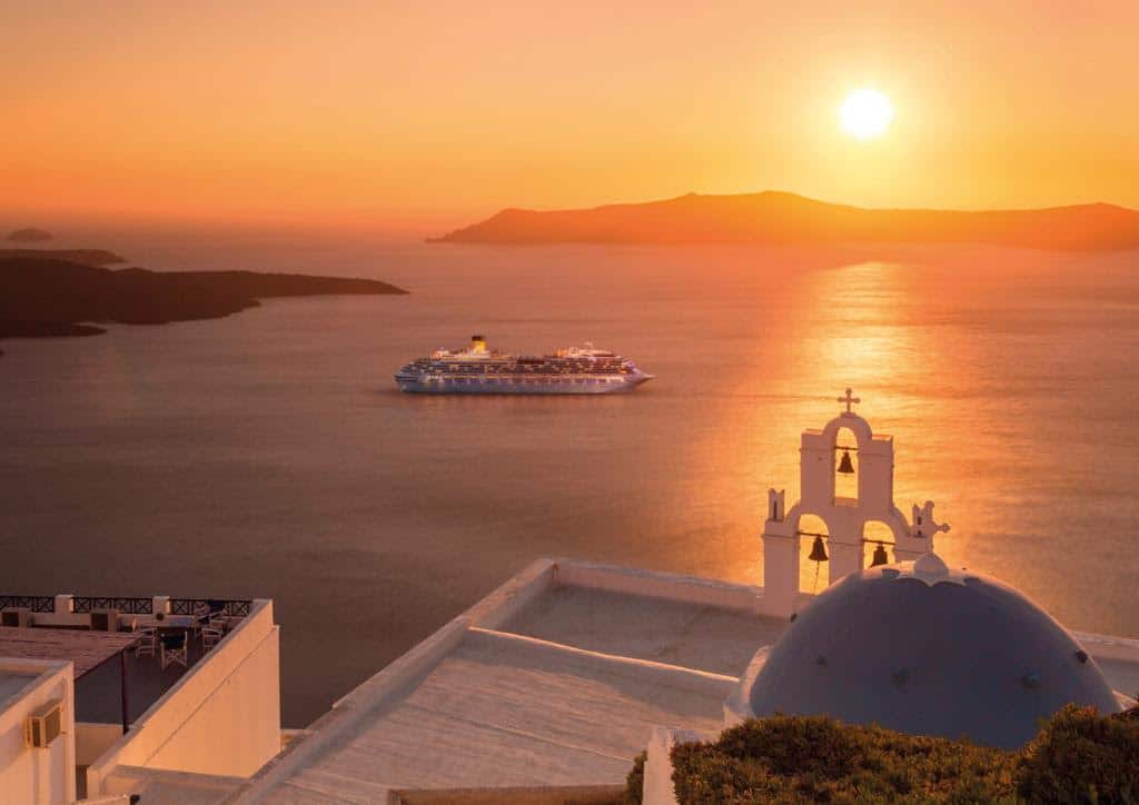 Un apéritif au coucher du soleil face à la caldeira de Santorin, le navire faisant une pause pour laisser les passagers admirer la vue.