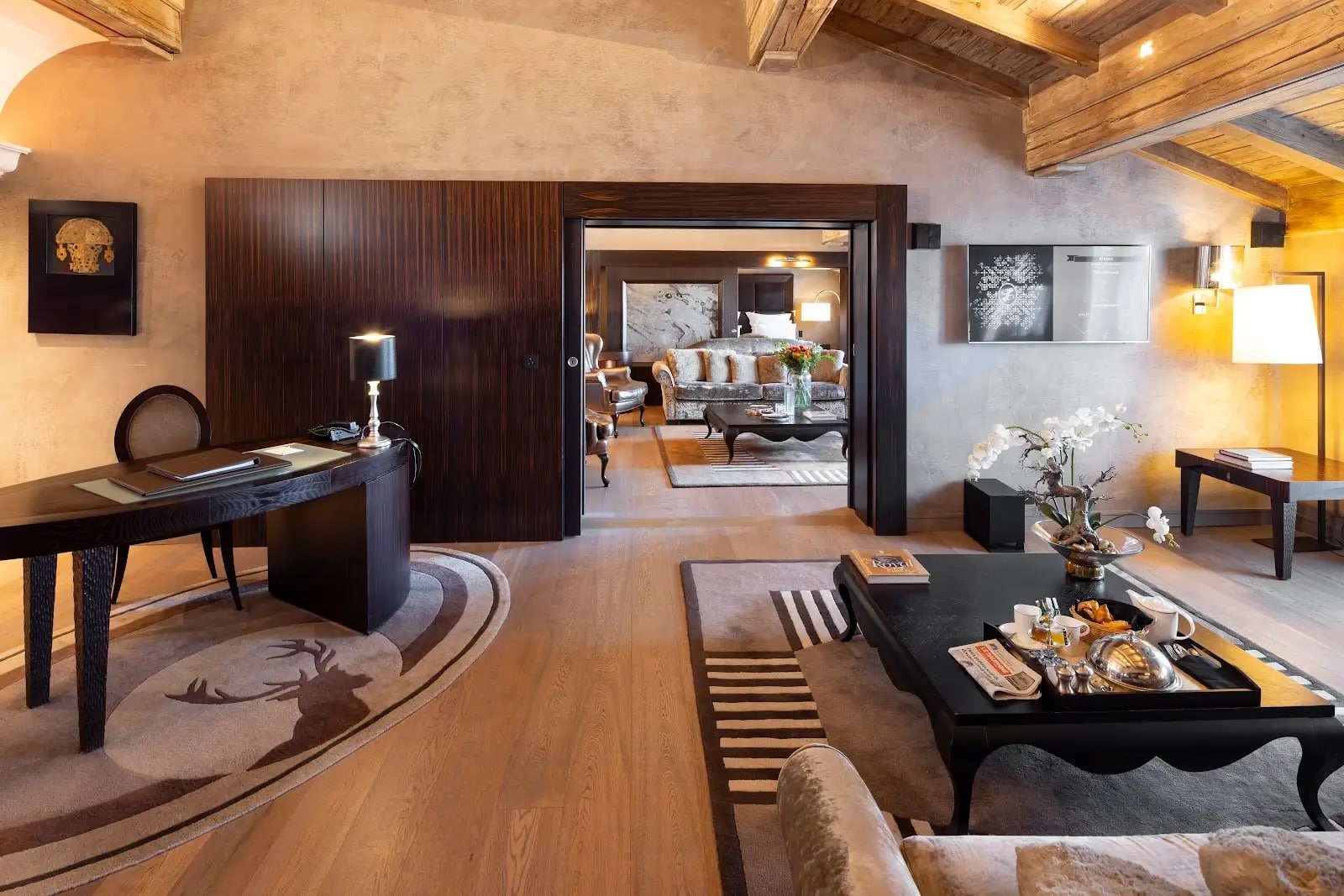 Dans sa version Terrasse, la Suite Présidentielle prolonge l’expérience vers l’extérieur. La terrasse, ouverte sur le panorama alpin, offre un point d’observation privilégié où la lumière redessine les reliefs au fil des heures.