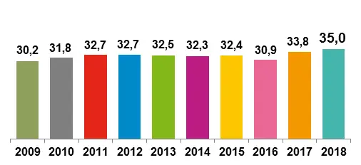 Avec 50 millions de touristes accueillis en 2018, Paris Région atteint un nouveau record de fréquentation. Les touristes ont ainsi généré 21,5 milliards d’euros au cours de l’année, soit 974 millions de plus par rapport à 2017 et 2,3 milliards d’euros de plus qu’en 2016. Dans l’hôtellerie francilienne, 35 millions d’arrivées hôtelières ont été comptabilisées au cours de l’année 2018, soit une hausse de 3,6% par rapport à 2017, en raison de la hausse des clientèles internationales (+8,7%), alors que dans le même temps la clientèle française est en légère baisse (-1,1%). Évolution du nombre d’arrivées hôtelières au cours des 10 dernières années (en millions) :