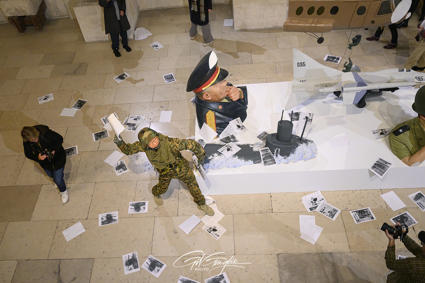 La performance donnée à Pierrefonds a pris la forme d’un rituel aussi visuel que sonore. Après les discours d’introduction, habillé et casqué en fantassin de l’armée rouge, Wang Du a fait le tour de son œuvre monumentale, jetant sur ses sculptures des liasses de photocopies de la presse chinoise reproduisant ses propres images de militaires et de tanks.