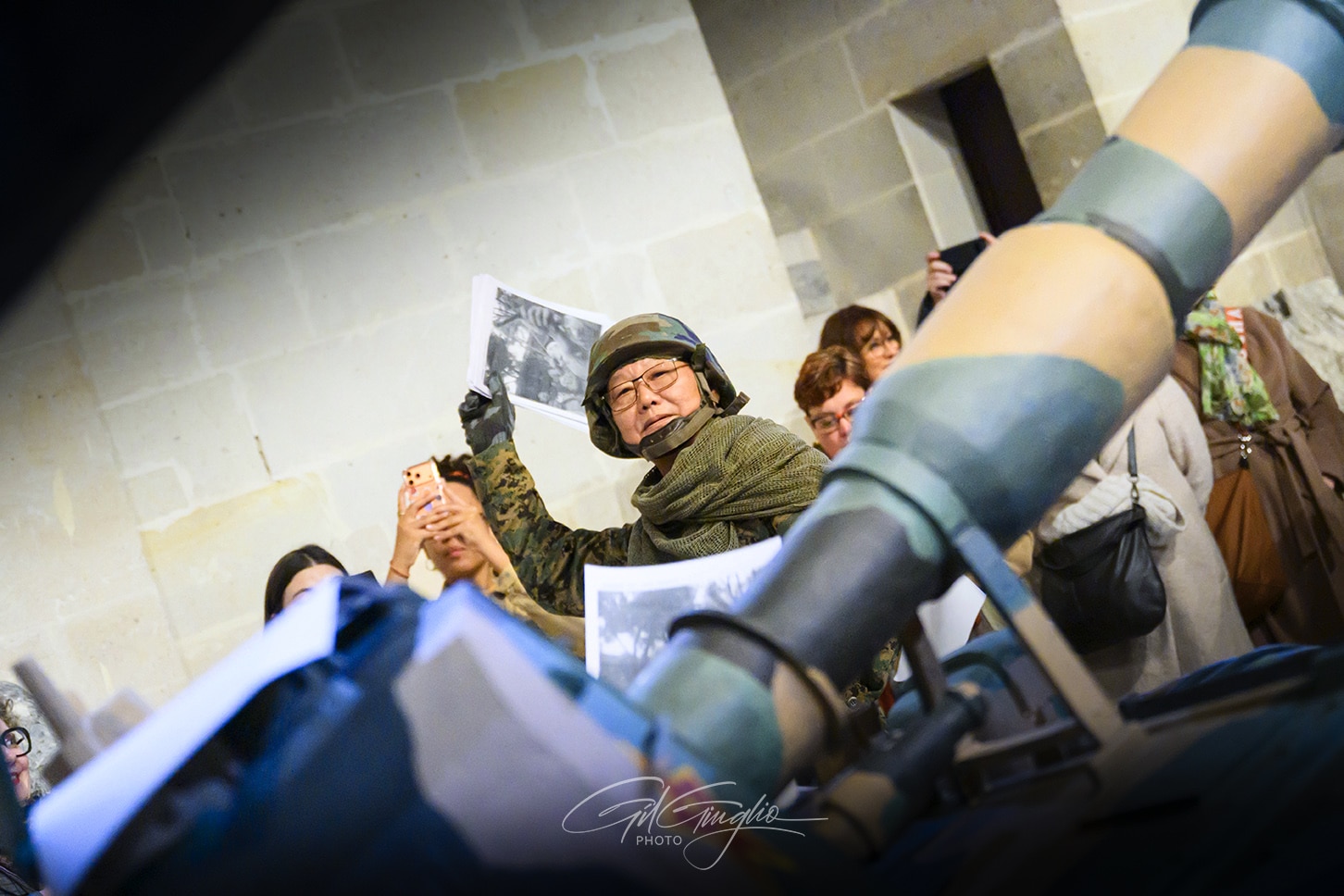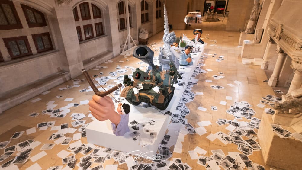 Installée au cœur du château, l’œuvre prend une résonance particulière dans cet environnement chargé d’histoire et de symboles. Entre statues, chapiteaux d’époques et tanks modernes, la confrontation des époques interpelle le visiteur : que reste-t-il du pouvoir des images, et comment la guerre se met-elle en scène, hier comme aujourd’hui ?