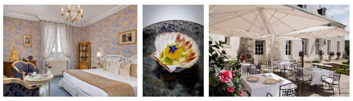 triptyque de photos avec le resto extérieur, une suite, et un plat gastronomique du Château de Beauvois