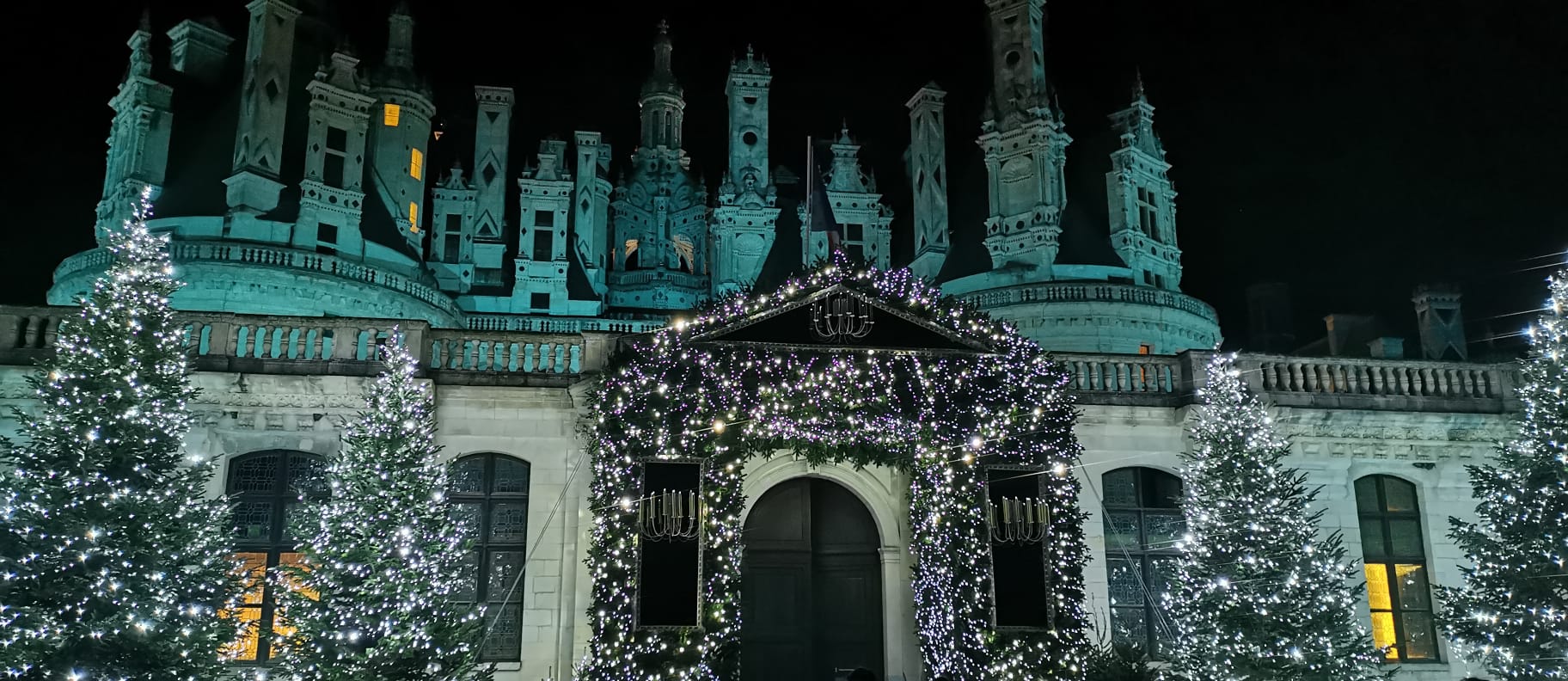 Dans les jardins à la française, les arbres soigneusement taillés s’habillent de guirlandes scintillantes, dessinant des silhouettes lumineuses qui accompagnent celles du château. Peu à peu, Chambord apparaît comme un domaine enchanté, presque irréel.