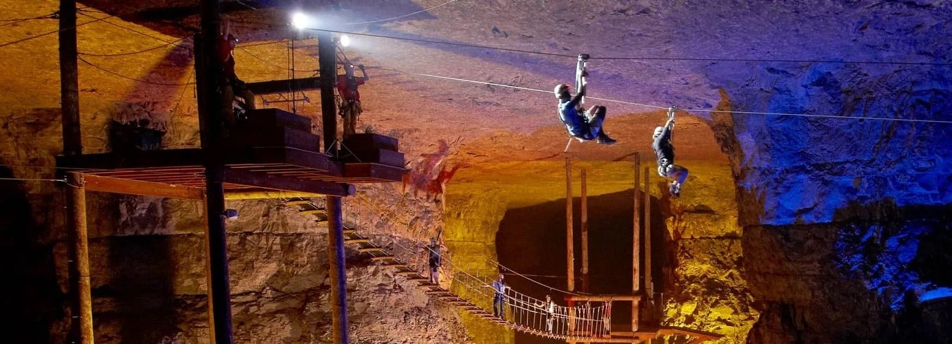Installé dans une ancienne mine de calcaire, ce parc d’aventure unique propose une expérience spectaculaire sous terre. On y trouve les seules tyroliennes souterraines au monde, des parcours aériens d’obstacles ainsi que des visites guidées en tramway à travers cet immense réseau de cavernes.