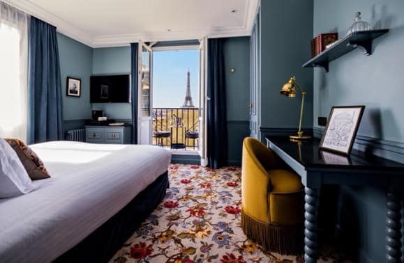 Les chambres du dernier étage bénéficient d’un balcon avec une vue à couper le souffle sur la Tour Eiffel.