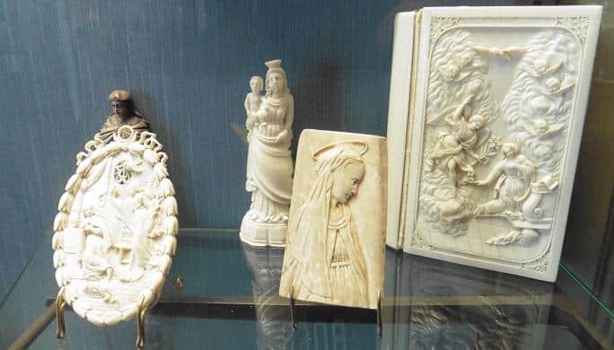 L’alternance de générations est constamment présente car l’ancienne galerie de desserte de la salle à manger de famille de Louis-Philippe fût transformée en office par le comte de Paris. Aujourd’hui elle abrite la grande collection de porcelaine de Louis-Philippe. La salle à manger est également un grand témoignage du choc de générations car elle alterne entre une décoration et des tableaux des époques Louis-Philippe et comte de Paris. En 1902 lors d’un incendie, la partie la plus luxueuse du château brûlât. Nommée la Galerie de Guise, elle abritait une boiserie murale de grande valeur et toute une série de portraits de famille heureusement retirés avant l’incident. En 2001, la ville d’Eu pût reconstruire cette salle mythique grâce à de nombreuses aides, le plafond, le parquet et les boiseries ont été totalement restitués et une collection de 141 portraits, dont la totalité de la Galerie de Guise recouvre à nouveau les murs. Dieppe : capitale de l’ivoire A partir du XVIIème siècle et durant de nombreuses années, Dieppe a été la ville phare du travail de l’ivoire grâce a ses artisans aux mains expertes qui ont permis à la ville de prospérer pendant près de deux siècles à travers le monde. Le château-musée de Dieppe est aujourd’hui le symbole de la ville, avec sa silhouette très fantasmagorique et son musée d’art et d’histoire qui est l’un des plus ancien de France. Il présente la plus grande collection d’ivoire d’Europe avec plus de 1000 pièces exposées dont 90% sont issues d’ateliers Dieppois. C’est au travers de nombreuses créations que l’ivoire trouve ses formes, dans le domaine maritime avec ses maquettes de navires, ses statues de marins ou encore ses cadrans solaires, dans le domaine religieux avec ses nombreux crucifies et statues et dans bien d’autres domaines avec des médaillons, des portraits, des bustes mais aussi des râpes à tabac. Il faut savoir que chaque objet arbore une variété et un style de motif propre au sculpteur et à sa pâte graphique. Et si vous avez soif de connaissance, le musée dispose d’une collection de livres nommés « Les cahiers de l’ivoirerie » regroupant par thème tous les objets exposés (religion, médaillons, maquettes de navires …)