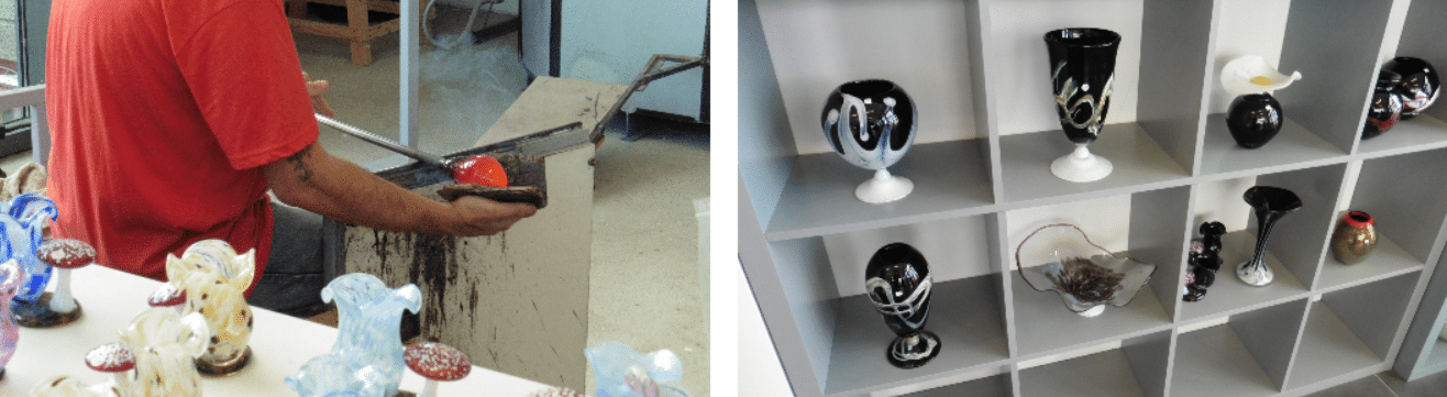 L’art du verre lui se distingue en deux types de métiers, le perlier tout d’abord travaille à l’aide de baguettes de verre transparentes, opaques ou translucides et d’un chalumeau. C’est le métier de Monsieur Marey qui façonne au sein même de sa boutique des perles de verre depuis presque trente ans maintenant. Pour ce faire, il fait chauffer le bout d’une baguette à l’aide de son chalumeau afin de faire entrer le verre en fusion, ses lunettes aux verres didymium lui permettent de se protéger des rayonnements nocifs pour les yeux. Pour assurer le bon déroulement d’une création, le verre ne doit pas descendre sous les 500°C, et lors du modelage d’une perle il l’a dépose sur une baguette en cuivre ou en acier nommée mandrin et y ajoute ensuite des motifs à l’aide de fines tiges de verre préparées au préalable. Une fois une production terminée, il l’a recuit dans un four adapté entre 480°C et 510°C en vue de donner de la stabilité à la matière, pour éviter la casse par exemple.