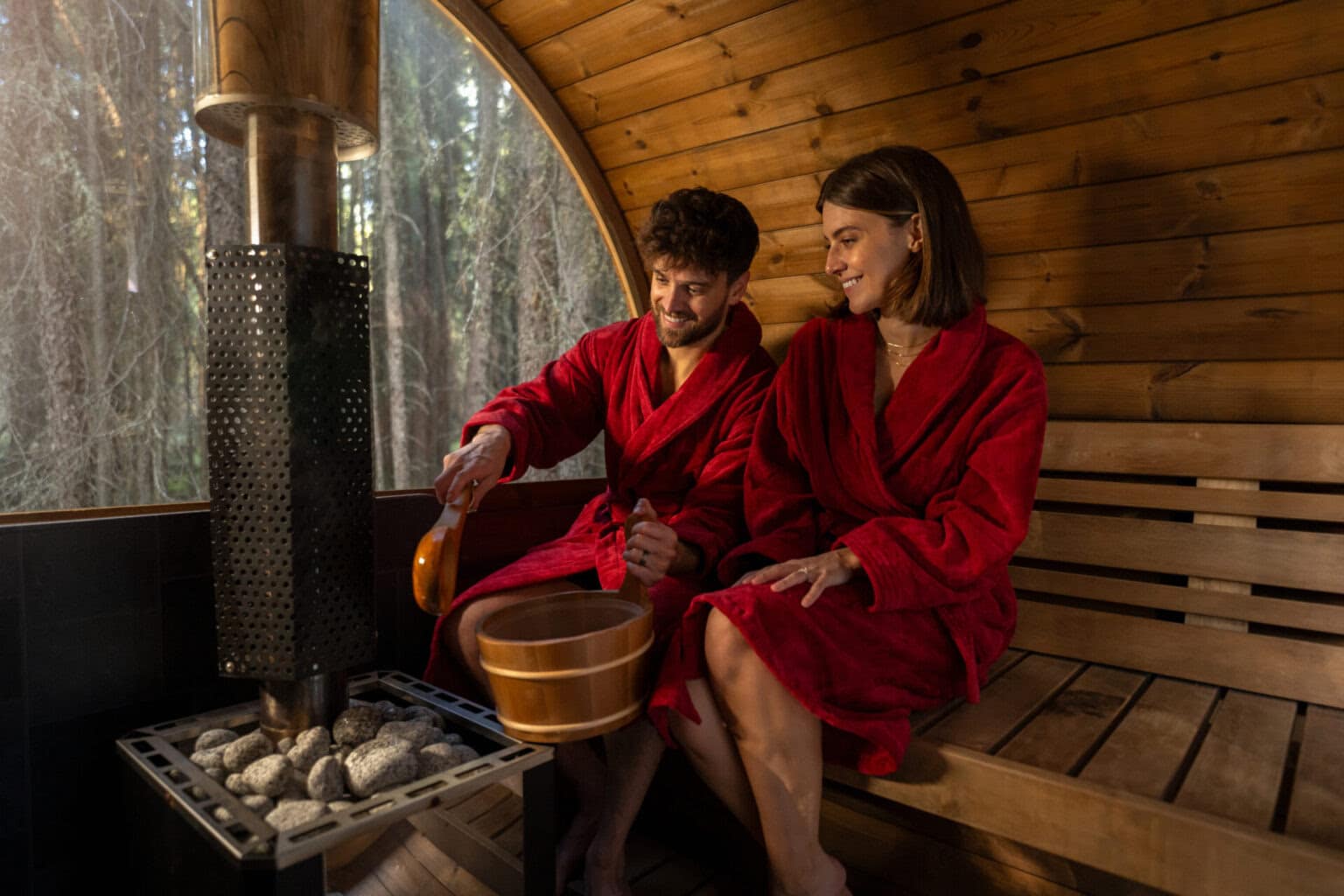 L’expérience “Wilderness Spa” offre un moment de bien-être naturel : bain à remous chauffé au bois, sauna en tonneau et plongeon froid, dans une cabane en pleine nature. Ici, le silence des arbres et la chaleur du feu deviennent un rituel de purification et de calme.