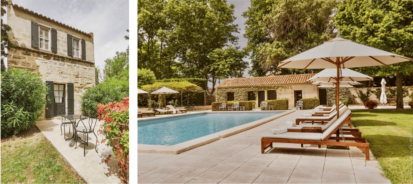 Les hôtes peuvent également profiter de jardins méditerranéens, d’un salon voûté propice aux échanges informels, ou simplement savourer un moment de calme au bord de la piscine.