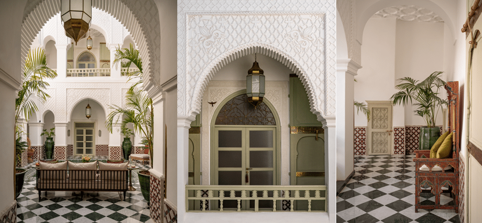 Le palais se déploie autour de trois univers distincts, trois patios autour desquels se répartissent les douze chambres : la Medersa, cour sereine inspirée des anciennes écoles de savoir où règnent symétrie, lumière apaisante et un magnifique bassin en zellige vert ; le Berbère, au charme plus rustique, avec sa cour carrée ponctuée d’orangers et d’une fontaine en pierre ; et la Douheria, « petite maison » en dialecte marocain, qui s’organise autour d’un olivier majestueux.